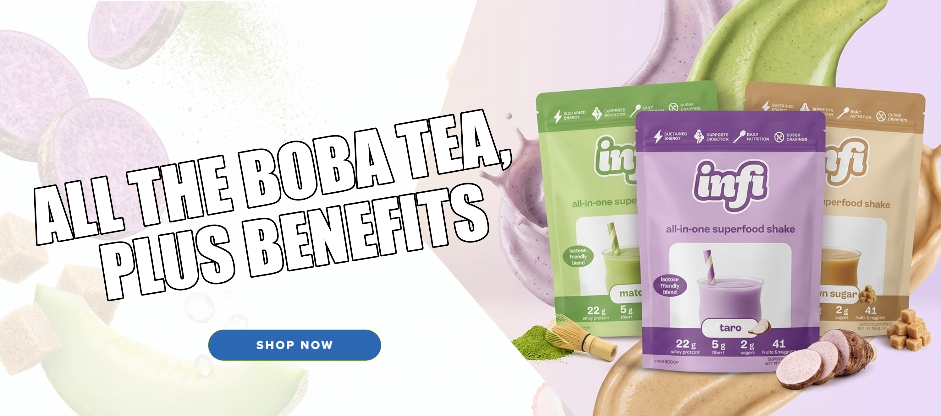 Infi is our all-in-one upgrade, combining 22g of whey protein, 5g of fiber, probiotics and real boba-inspired flavors into one simple daily scoop. Easy to mix, enjoyable to drink, and designed to fit real life.