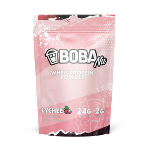 Introducing our Lychee Boba Tea Protein Powder made with whey protein powder, a delicious and nutritious blend designed to satisfy your cravings for boba tea while providing you with the protein your body needs. This innovative boba protein powder captures the essence of the popular bubble tea flavor lychee, creating a unique and refreshing protein shake experience. The Boba Nutrition Lychee Milk Tea is a refreshing and delicious drink that combines the sweet, and milk flavor of lychee with creamy coconut creamer. Packed with 24g of protein and sweetened with Reb M!